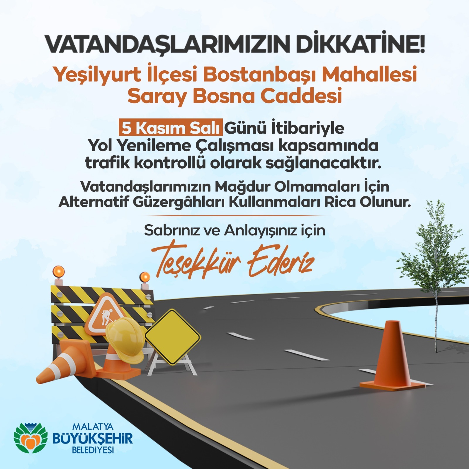 “Yeşilyurt İlçesi Bostanbaşı Mahallesi Saray Bosna Caddesi 5 Kasım Salı günü itibariyle yol yenileme çalışması kapsamında trafik kontrollü olarak sağlanacaktır.