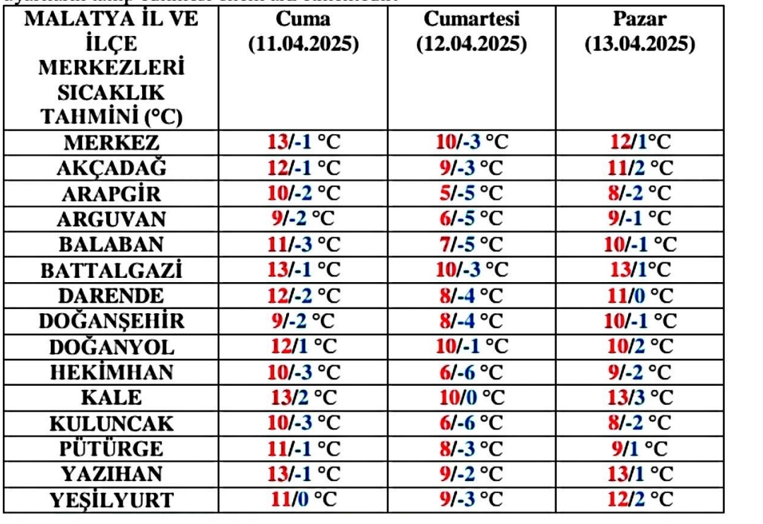Malatya için hava tahminleri şu şekilde açıklandı: