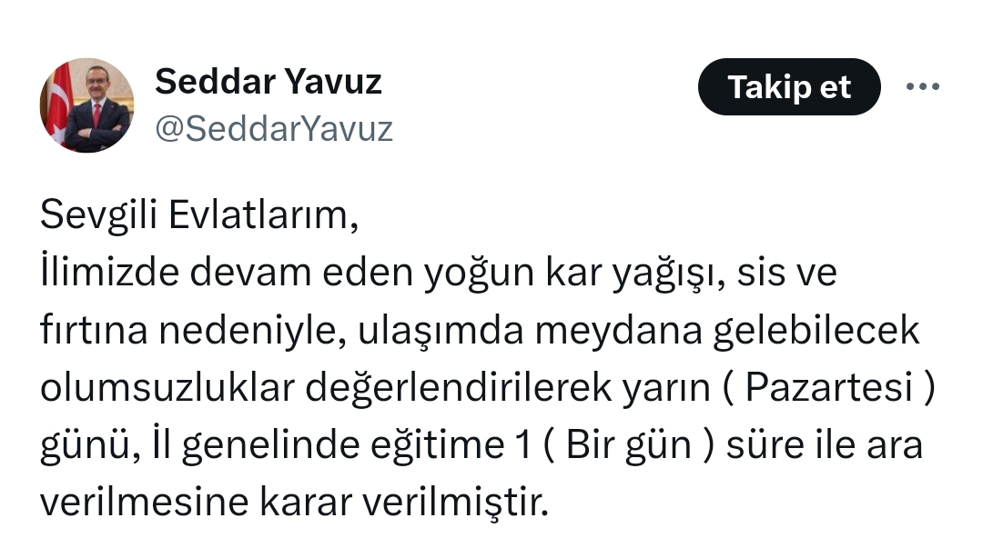 “İlimizde etkili olan yoğun kar yağışı, tipi ve buzlanma tehlikesi nedeniyle vatandaşlarımızın güvenliğini sağlamak amacıyla 25 Kasım 2024 Pazartesi günü ilimiz genelinde tüm resmi ve özel örgün ve yaygın eğitim kurumlarında eğitim ve öğretime 1 (bir) gün süreyle ara verilmiştir.
