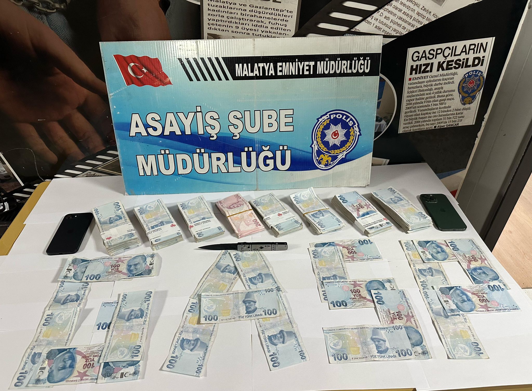 Mağdur bir şahsa ait 1 adet telefon, 68.300 TL ve kesici aletler ele geçirildi.